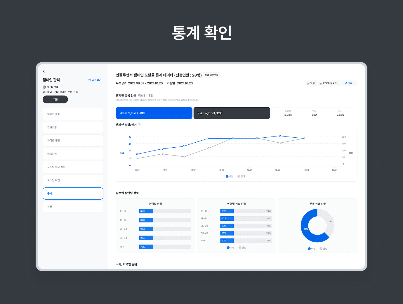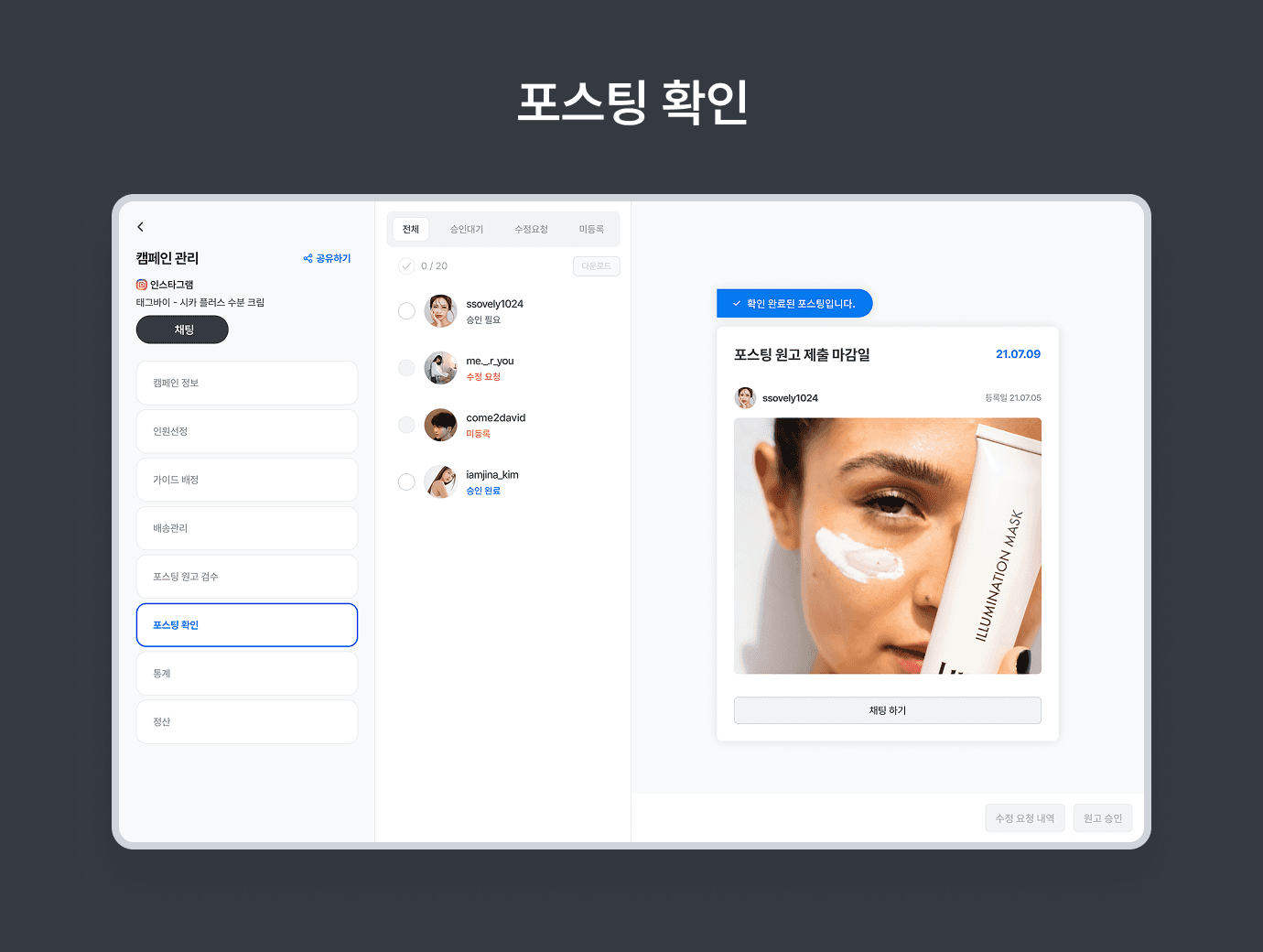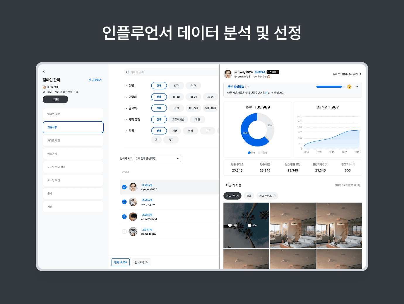 인플루언서 체험단 마케팅을 자동화할 수 있는 SaaS입니다. 인플루언서 모집부터 데이터 분석, 포스팅 모니터링, 성과 분석, 정산까지 자동화하고 셀프로 직접 마케팅 캠페인을 운영할 수 있습니다.